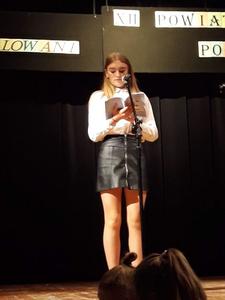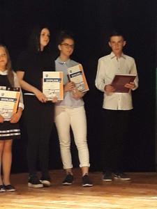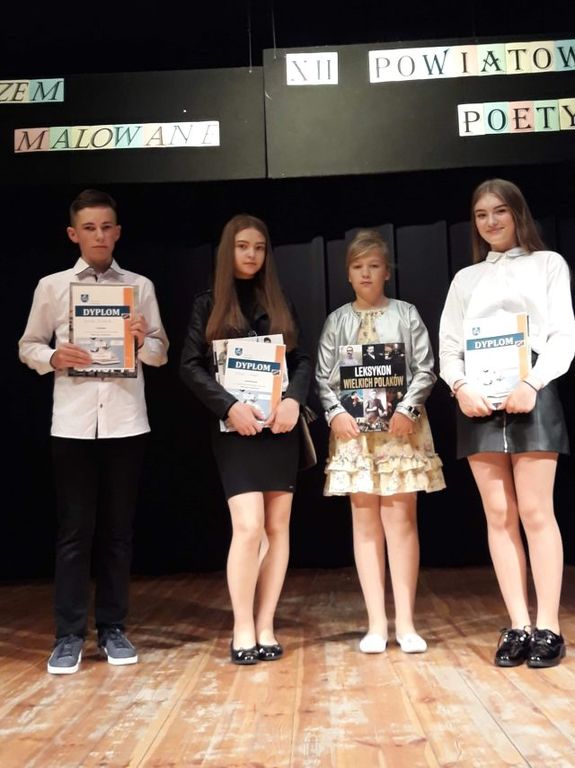 Dnia 28 maja 2019 roku czworo uczniów naszej szkoły pod opieką p. Hanny Czajkowskiej wzięło udział w XII Powiatowym Konkursie Poetyckim "Wierszem malowane" w Czyżewie. Na konkurs nadesłano 60 utworów na dowolny temat napisanych przez uczniów szkół podstawowych, gimnazjów i szkół średnich z powiatu wysokomazowieckiego. Na uroczystości podsumowującej uczniowie recytowali swoje utwory. Następnie jury ogłosiło wyniki. Nasi uczniowie wypadli znakomicie.