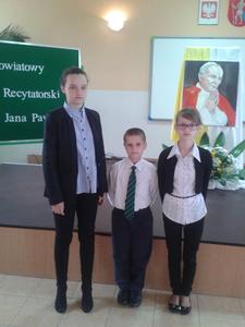 Dnia 29 kwietnia 2015 r. w Kuleszach Kościelnych odbył się Powiatowy Konkurs Recytatorski Poezji Jana Pawła II. Naszą szkołę reprezentowali uczniowie: Jan Łapiński (kl. III), Maria Łukasiewicz (kl. VI) i Wiktoria Zaleska (kl. IIIB gimnazjum). W konkursie wzięło udział ponad 30 recytatorów. III miejsce w kategorii klas IV-VI zdobyła Maria Łukasiewicz.