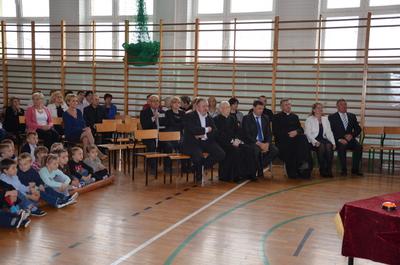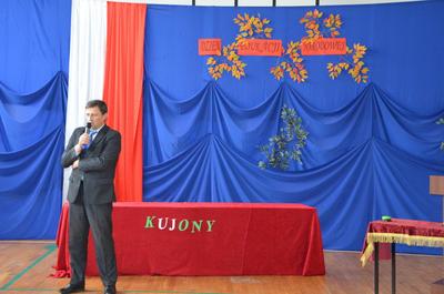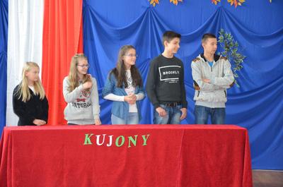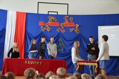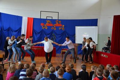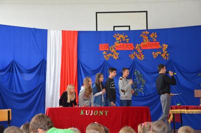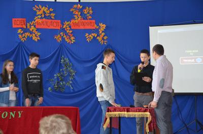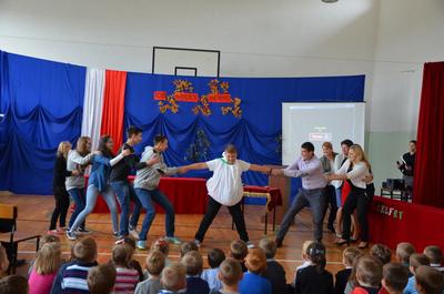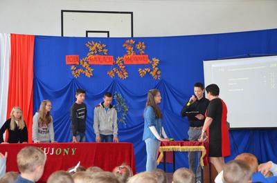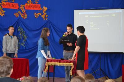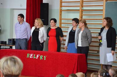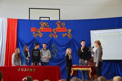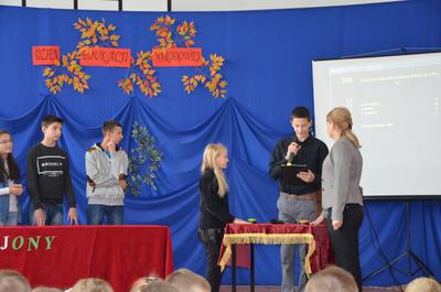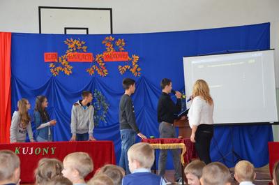 We wtorek 13 października uczciliśmy Dzień Edukacji Narodowej potocznie zwany Dniem Nauczyciela. Na sali gimnastycznej, przy udziale zaproszonych gości, uczniowie podziękowali nauczycielom oraz pozostałym pracownikom szkoły za wysiłek wkładany w ich wychowanie i edukowanie, a następnie życzyli zdrowia, wytrwałości i cierpliwości na każdy dzień. Po części oficjalnej i rozdaniu czerwonych róż, przystąpiliśmy do wspólnej zabawy, którą w tym roku była szkolna Familiada. Naprzeciwko siebie stanęły dwie drużyny - Kujonów oraz Belfrów. Pytania dotyczyły życia szkoły, a odpowiedzi uzyskaliśmy wcześniej przeprowadzając ankiety wśród uczniów i nauczycieli. Przewaga Kujonów rosła z każdą minutą i to właśnie oni wygrali zmagania - w nagrodę zrobili sobie pamiątkowe zdjęcie z "rzepą" :) Dziękujemy drużynom za wspólną grę.