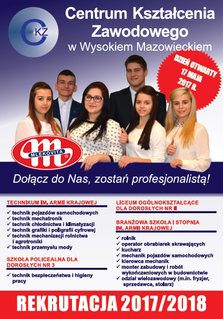 W dniu 9 maja 2017r. odbyło się spotkanie uczniów klas III gimnazjum z przedstawicielami Centrum Kształcenia Zawodowego w Wysokiem Mazowieckiem. Delegacja uczniów na czele z Panem Dyrektorem Józefem Sokolikiem przedstawiła naszym gimnazjalistom bogatą ofertę edukacyjną kształenia zawodowego na rok szkolny 2017/2018 oraz zaprosiła na dzień otwarty, który odbędzie się 17 maja 2017r.