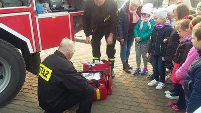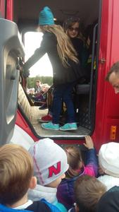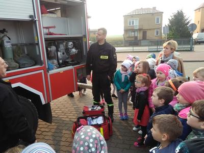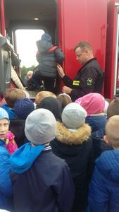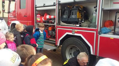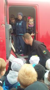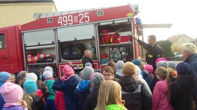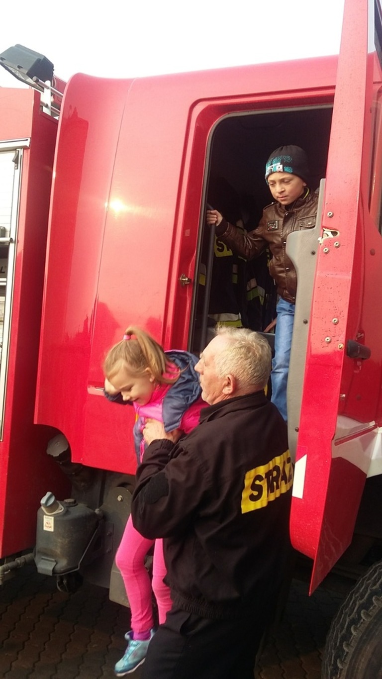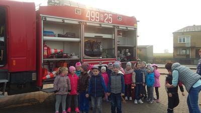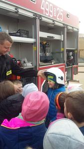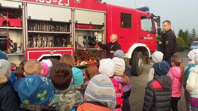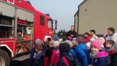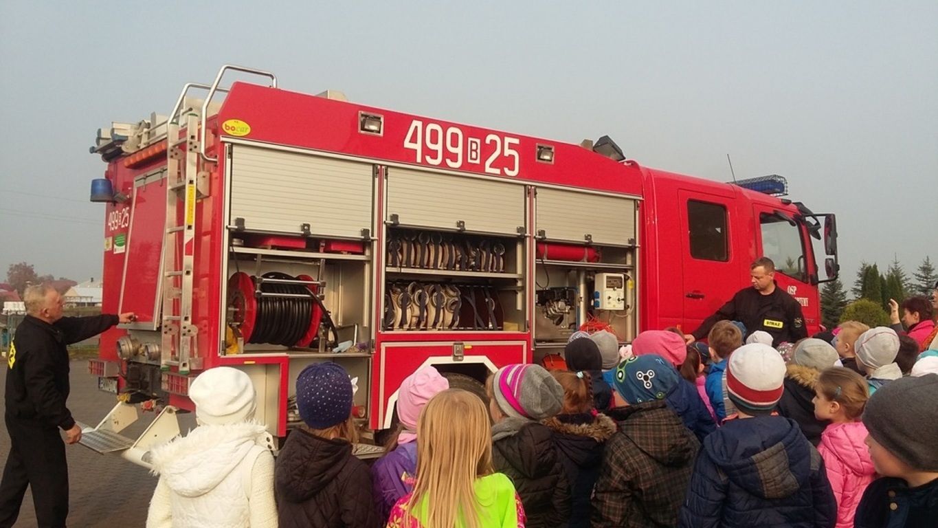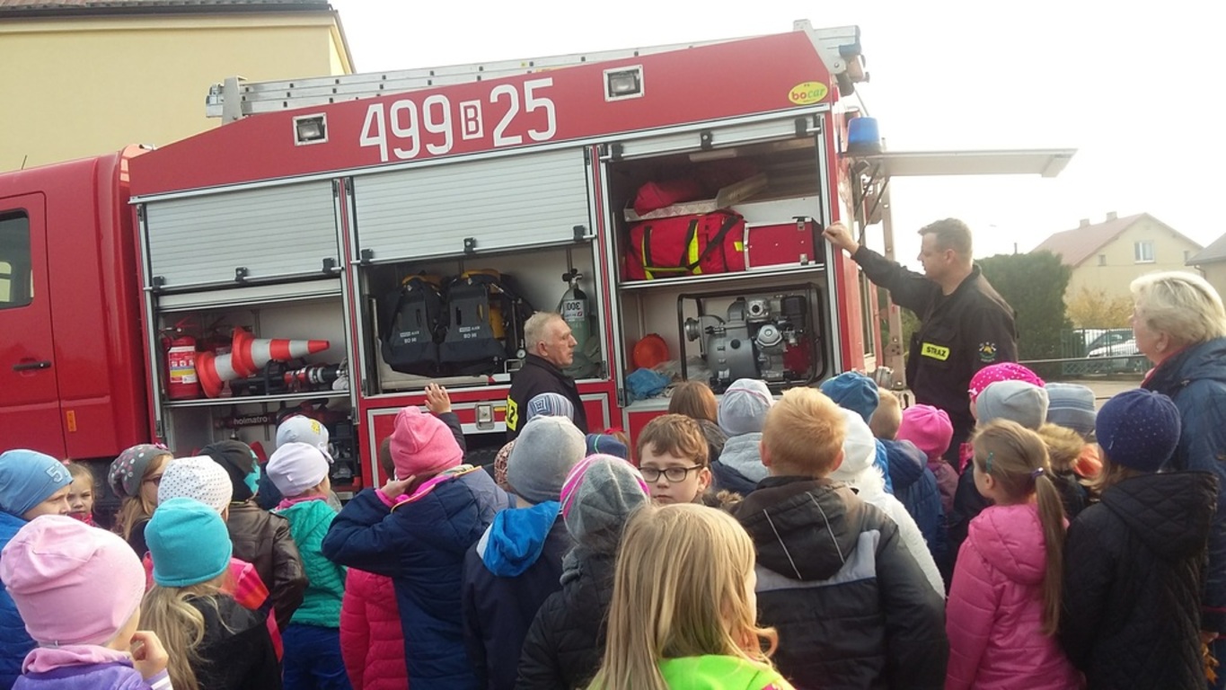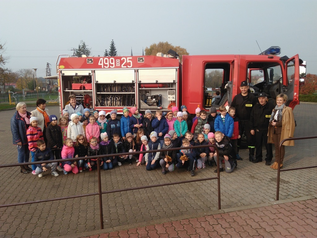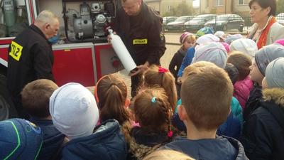 W dniu 18.10.2017r. dzieci z klas I-III oraz przedszkolaki z wielką radością powitały na placu szkolnym wyjątkowych gości - Pana Tomasza Konopkę oraz Pana Jana Choińskiego - Strażaków Ochotniczej Straży Pożarnej w Kobylinie-Borzymach. W trakcie spotkania dzieci mogły jeszcze więcej dowiedzieć się o ciężkiej, niebezpiecznej i odpowiedzialnej pracy strażaka. Z bliska miały możliwość obejrzeć sprzęt, który wykorzystywany jest  podczas prowadzenia akcji ratowniczo-gaśniczych.Największe zainteresowanie wzbudził wóz strażacki, do którego każdy mógł wejść i choć przez chwilę poczuć się jak STRAŻAK.