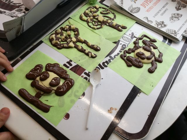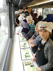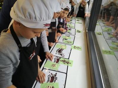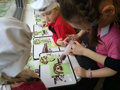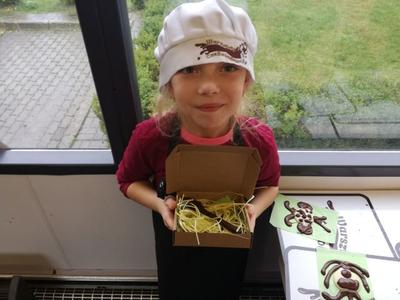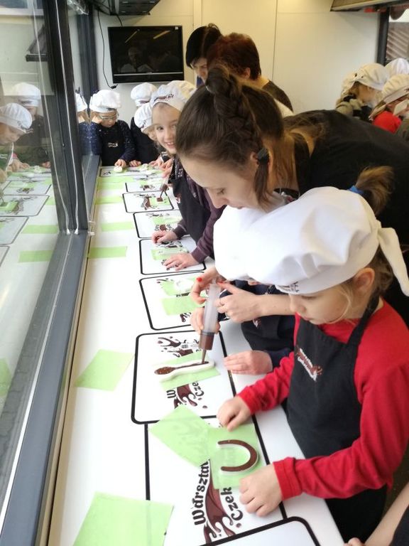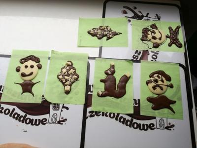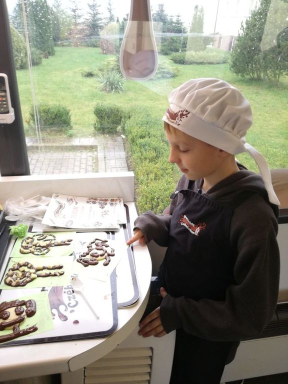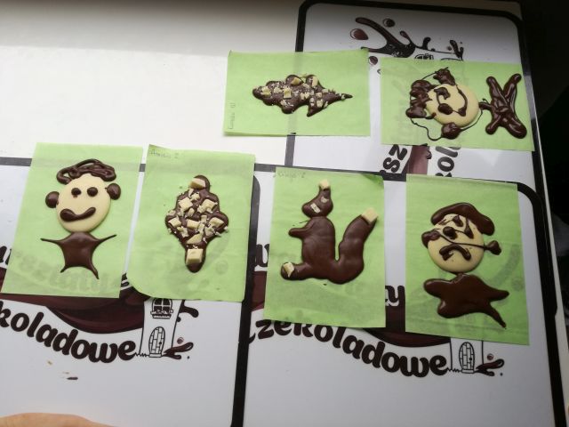 Zaraz potem nastąpiła degustacja – dzieci zajadały rozgrzaną czekoladę, a następnie kosztowały jej trzech innych rodzajów. Później każdy otrzymał foremkę i przy pomocy płynnej czekolady wykonywał słodkie cuda. Kolejną zabawą było rysowanie czekoladą i dekorowanie swojego dzieła.