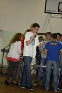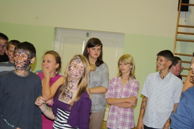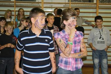 Uczniowie klas II i III gimnazjum przygotowali na powitanie swoich kolegó ciekawe konkurencje. Aby wkroczyć w progi gimnazjum trzeba odbyć niezwykły chrzest. Trzeba mieć sprawność fizyczną i oczywiście ogromne poczucie humoru.