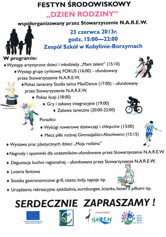 Zespół Szkół w Kobylinie-Borzymach serdecznie zaprasza wszystkich mieszkańców i sympatyków Gminy Kobylin-Borzymy na festyn środowiskowy "Dzień Rodziny", który odbędzie się 23 czerwca 2013r. w godz. 15.00-22.00.