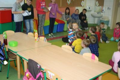 Uczniowie z Koła Przyjaciół Biblioteki i Klubu Miłośników Książki zaprezentowali wiersze dla dzieci o tematyce ,,Moja rodzina” połączone z zabawami grupowymi. Czytanie wrażeniowe było cyklem spotkań z okazji ,,Dnia Głośnego Czytania” dla przedszkolaków i uczniów klasy ,,0”. Dzieci uważnie słuchały i dobrze się bawiły.