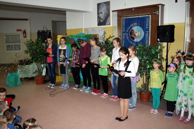 Tegoroczna impreza wiosenna odbyła się w dniu 27.03.2014 roku. Adresatami  tych występów były dzieci i nauczyciele szkoły podstawowej. Poetyckie i muzyczne prezentacje w wykonaniu uczniów gimnazjum i szkoły podstawowej w atmosferze radosnej wiosny spełniły nasze oczekiwania. Pozwoliły zrealizować cele, a mianowicie zainteresować wszystkich poezją oraz muzyką poważną, uwrażliwić na piękno przyrody i zmian w niej zachodzących. Cała impreza wraz z wystrojem wystawki wiosennej cieszyła się dużym zainteresowaniem i dostarczyła wielu wrażeń artystycznych.